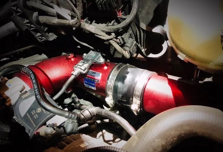 Die FTP Charge Pipe besteht aus CNC-gefrästem Aluminium und ist in einem auffälligen Rot eloxierten Finish ausgeführt – ein echter Hingucker im Motorraum.